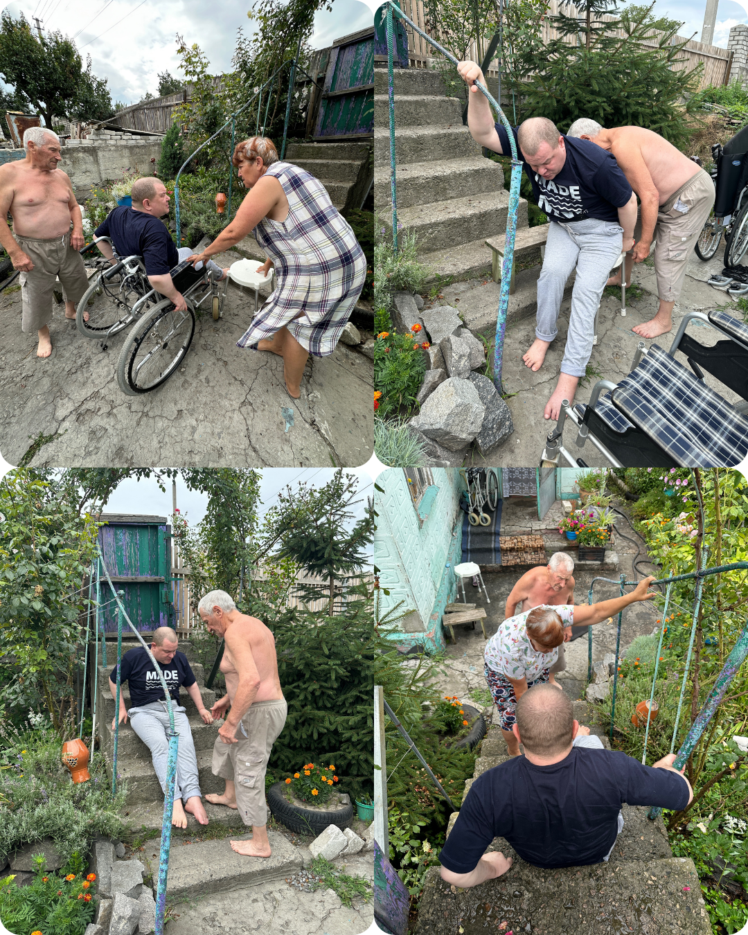 Крісло треба розвернути, підставити маленький стільчик, він підводиться на руках, підтягується і пересідає на стільчик. Потім він сідає на бетон або навіть просто на землю — НА ЗЕМЛЮ — бо інакше ніяк. Тоді, сходинка за сходинкою, він перетягує себе вгору, а його ноги просто тягнуться за ним. Потім разом ми тягнемо його знову на стільчик, потім на крісло, і лише з нього він може перелізти в авто.